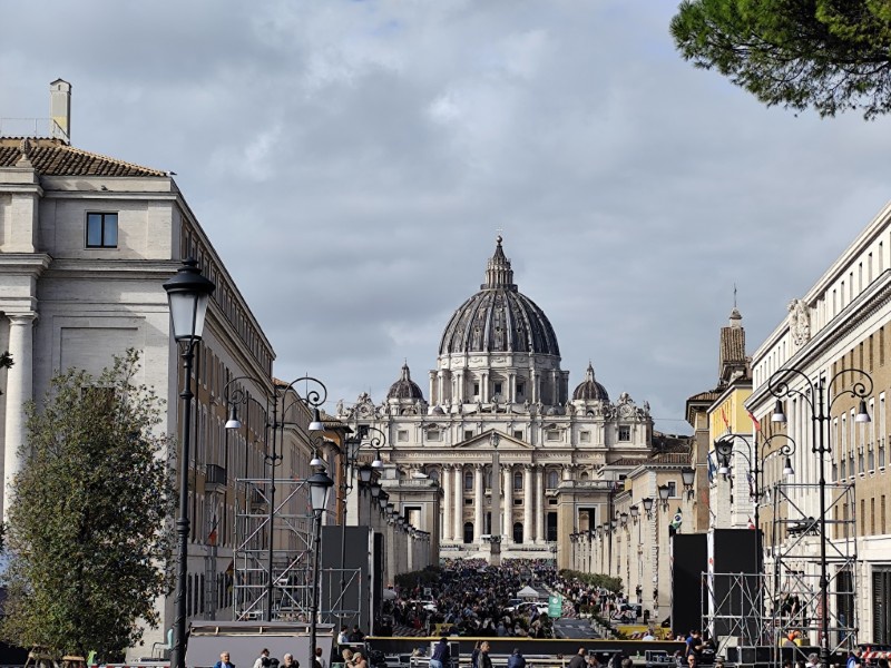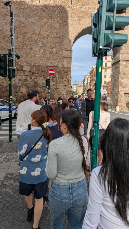 ローマ2日目は、海外から参加するメンバー全員で昼食をとるところから始まりました。ホテルはヴァチカン市国のサンピエトロ広場・寺院まで徒歩7分くらいの距離で、日曜日ということもあり非常に多くの巡教者の方でごった返していました。昼食会場まで人込みをかいくぐりながら向かいました。