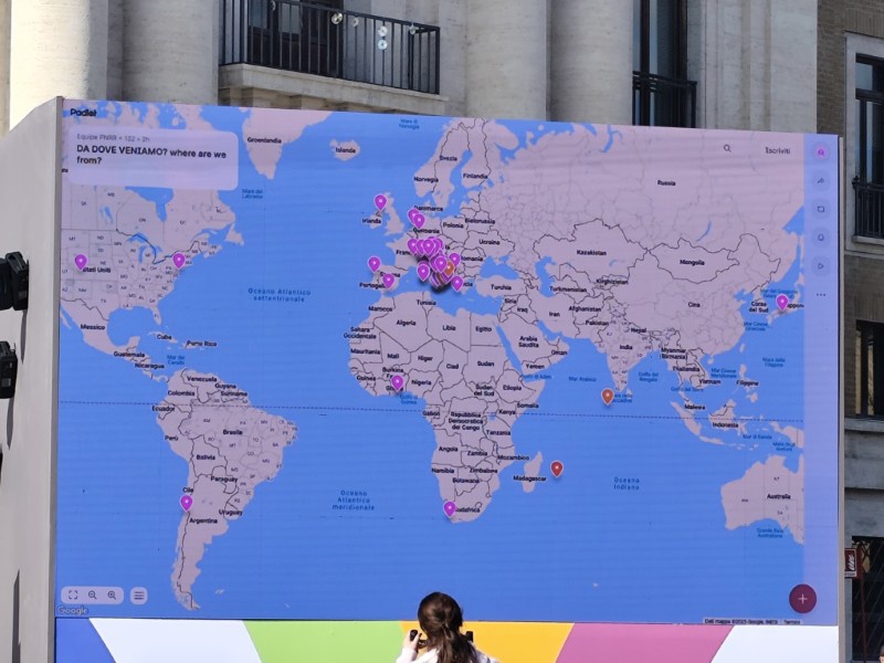 ワークショップの締めとして、野外のステージで、イタリアの先生方とインターンナショナルの先生たち(イタリア語圏外の先生たち、日本含む)が合同で最後の集会がありました。来場している教員がピン留めした世界地図をもとに始まり、アクティビティ、最後に集合写真と非常に充実した研修のフィナーレでした。