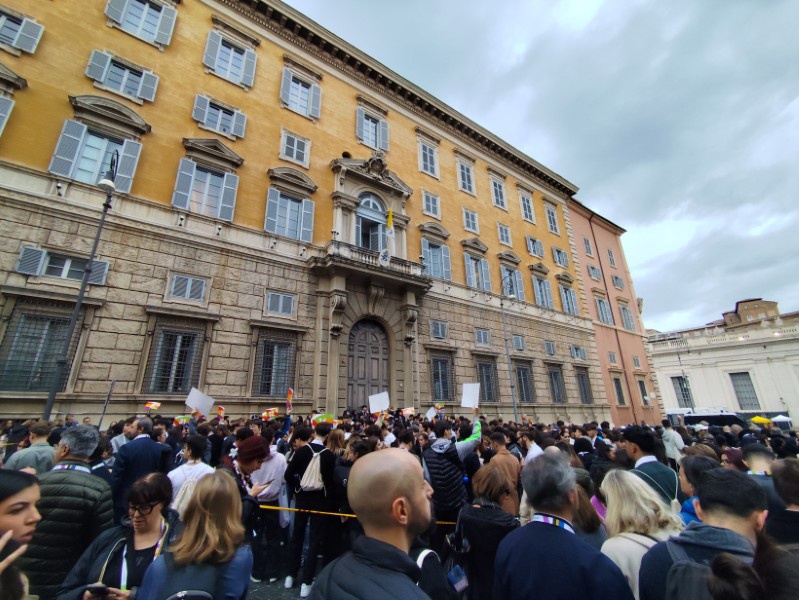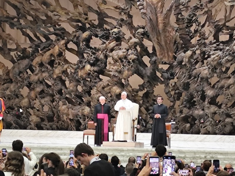 イタリアの方々にとってもローマ法王を直接見られる、触れられる機会は貴重であることがわかるほど、熱狂的な雰囲気を体験しました。入場後は、静寂のなかローマ法王のお言葉に耳を傾けている姿も、とても印象的でした。おそらく一生に一度の経験を、本校の生徒は体験したことと思います。