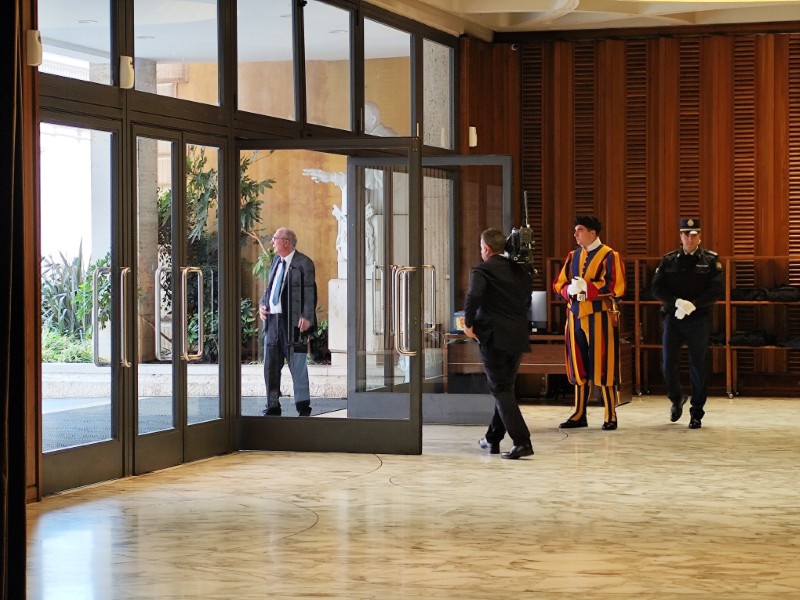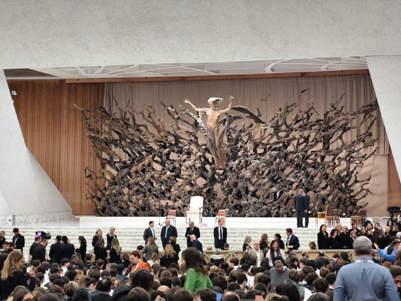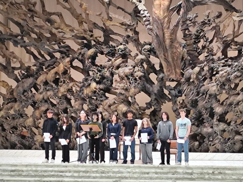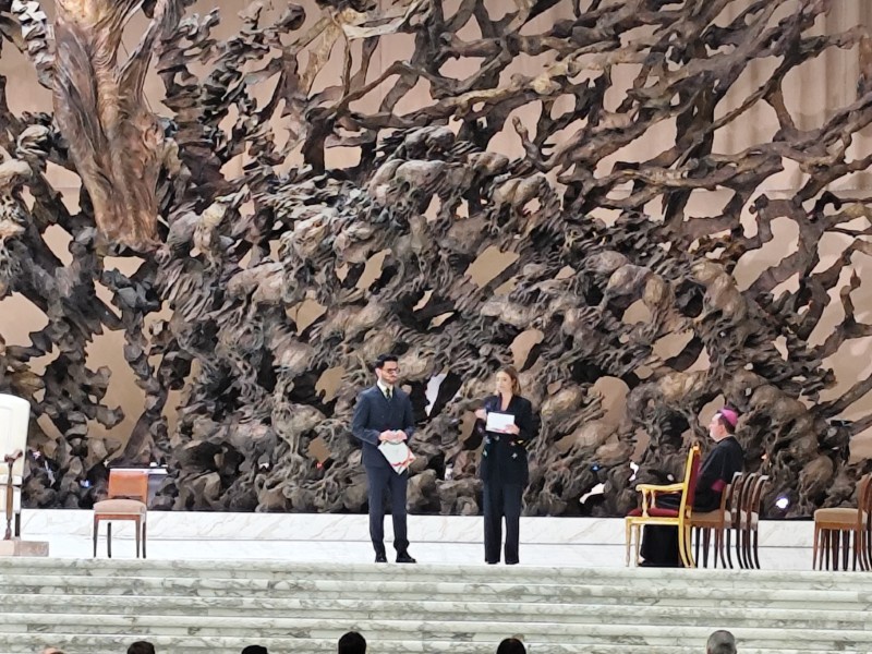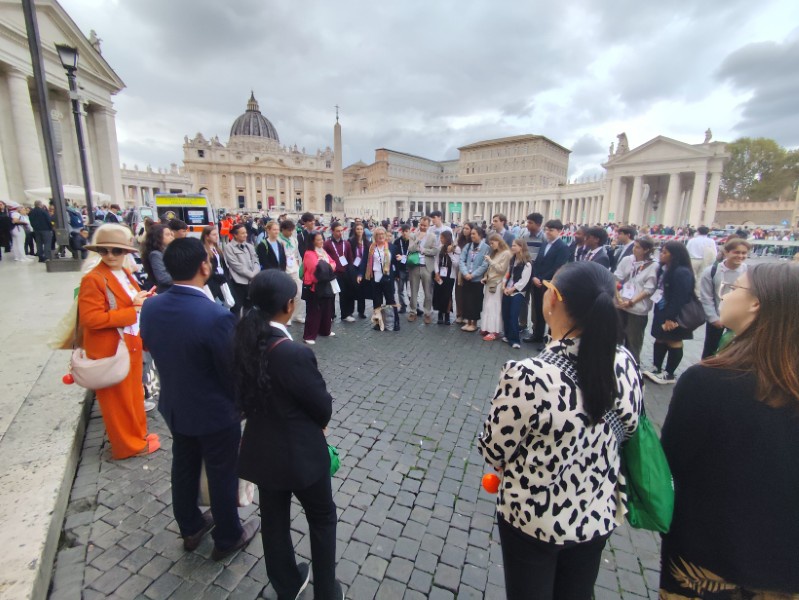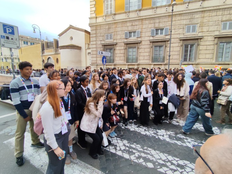 閉会式は10時会式でしたが、ホールへの入場に時間がかかるということで、パウロ6世記念ホールの入り口に朝7時10分に集合をしました。閉会式は、Jubilee of Education 全体のもので、今回ワークショップに参加していた生徒・教職員のみならず、他の小学生から高校生まで多くの参加者がいて、5000名入る会場は満席になっていました。また、ローマ市長や、教育大臣はもちろんのこと、今回はローマ法王のご臨席も賜る、大変貴重な式となりました。